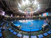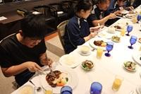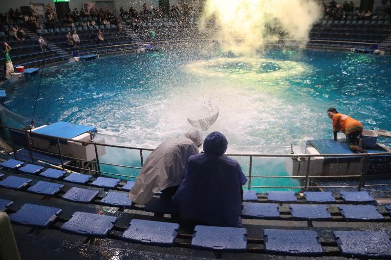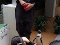| ペンギン達のミニパフォーマンスを楽しみました。 | イルカショーでは光と音楽でショーが盛り上がります。あまりの水しぶきでびしょ濡れに!? | 夕食をおいしそうに食べていました。 |