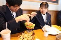 ハンバーガーを自分で重ねます。緊張の一瞬。 | こちらのグループはフードコートで昼食。おいしそうですね! |