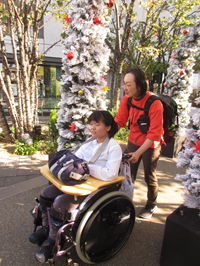 | 夕食もディズニーランドで「いただきます」 | 先生とお揃いのポップコーンバケットを購入。ポップコーンもおいしく食べました。 | ディズニーランドは既にクリスマスカラー、夜にはツリーのライトアップがありました。 |