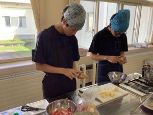 先週4日間の産業現場等における実習を終え、今週は学級で楽しく調理実習を行いました。今回は「カレーライス」「塩キャベツ」「りんごゼリー」を作りました。手順や役割を確認しながら、みんなで協力して調理をすることができました。学級の畑で育てたジャガイモが入ったカレーライスはとてもおいしく、たくさんおかわりしました。