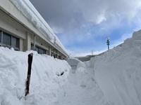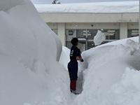 体の半分が埋まるほどの雪が積もっていますが、生徒達は雪をかき分けながら歩き、避難経路の除雪に取り組みました。